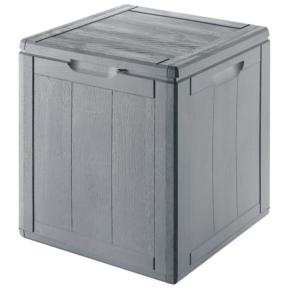 - Aufbewahrungsbox aus grauem Kunststoff mit Holzoptik