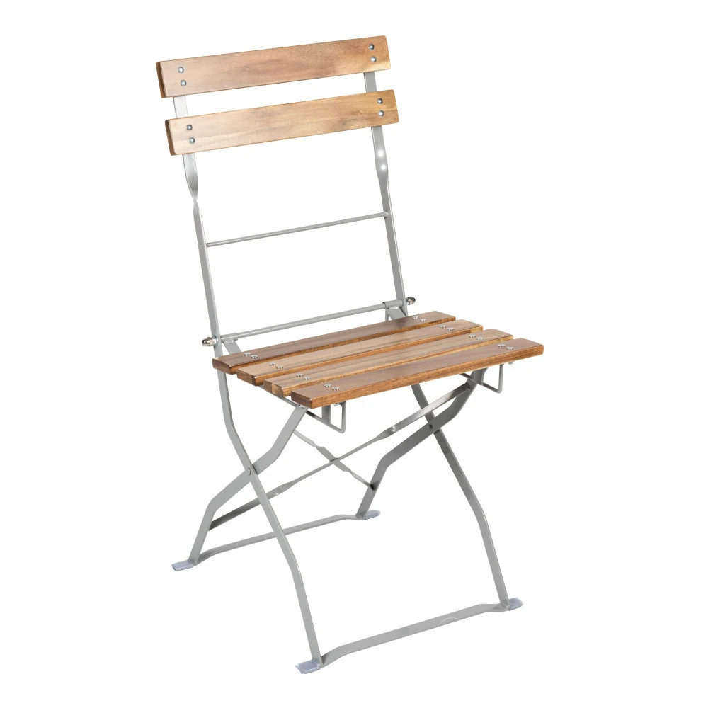 Robuster Biergarten-Stuhl aus Akazienholz, mit Stahl-Gestell wetterfest pulverbeschichtet. Mit einem Handgriff kann der Stuhl platzsparend zusammengeklappt werden.