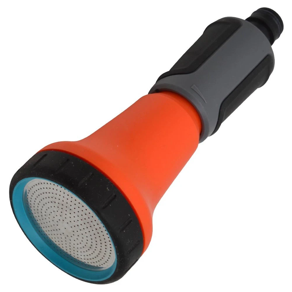 Die universelle Bewässerungsbrause von Gardena dient zur einfachen und bequemen Bewässerung von Topflanzen oder Rasenflächen. Hierbei lässt sich der Wasserdruck durch das Drehen des Kopfes an der Brause stufenlos und absperrbar regulieren. Darüber hinaus schützt der weiche Kunststoffring am Kopf die Handbrause vor Beschädigungen. Der 1/2″-Anschluss der Gartenbrause passt perfekt zu allen gängigen Schnellkupplungen, vorhandene Schnellkupplungen können problemlos verwendet werden. Dank des rutschfesten Weichkunststoffs liegt die Bewässerungsspritze angenehm in der Hand und verhindert auch bei größeren Flächen ein schnelles Ermüden.