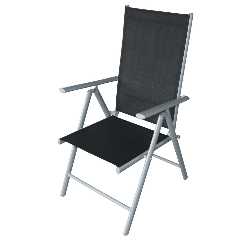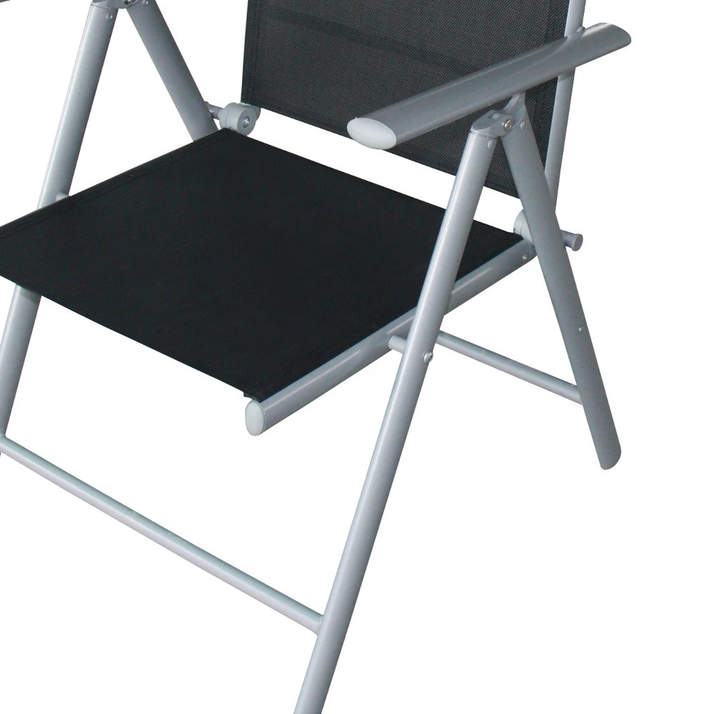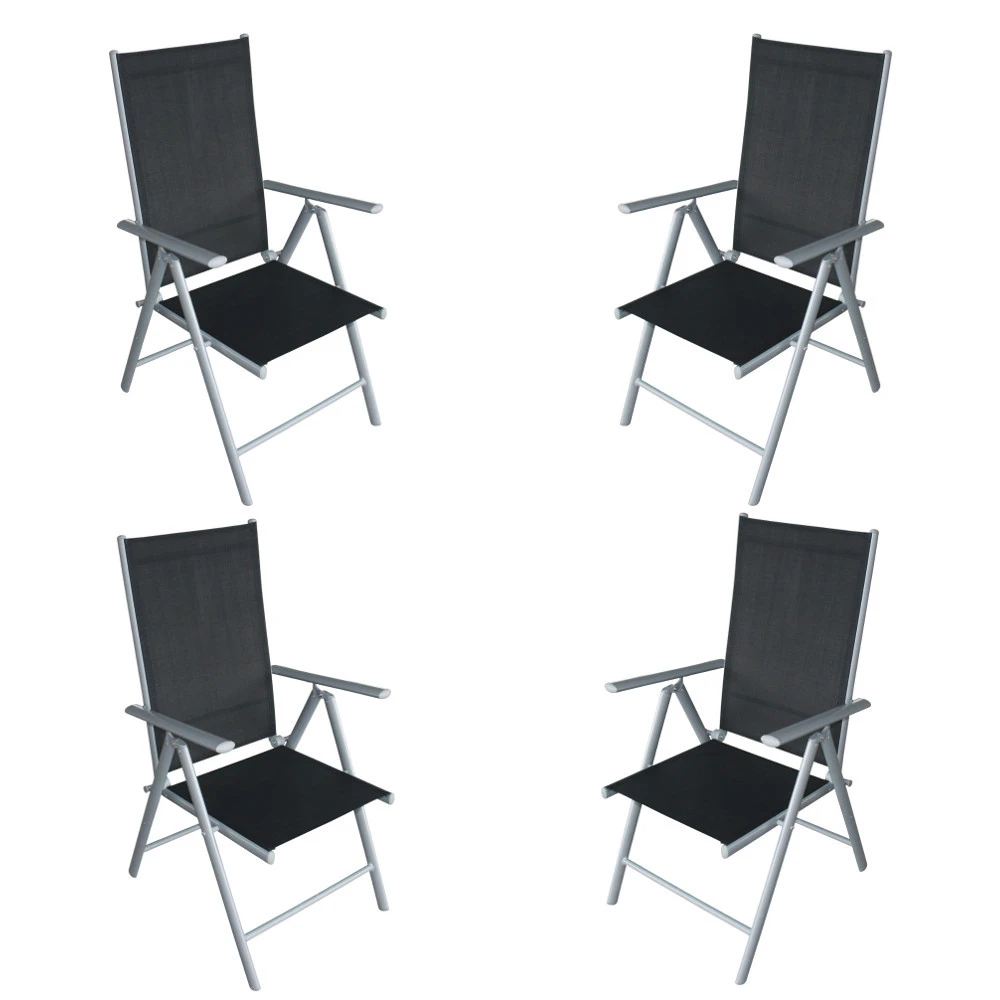 Das 4-teilige Gartensessel-Set beinhaltet 4 klappbare GartenstĂŒhle mit schwarzer Textilbespannung und grauem Aluminiumgestell. Die wasserfesten KlappstĂŒhle sind platzsparend verstaubar.