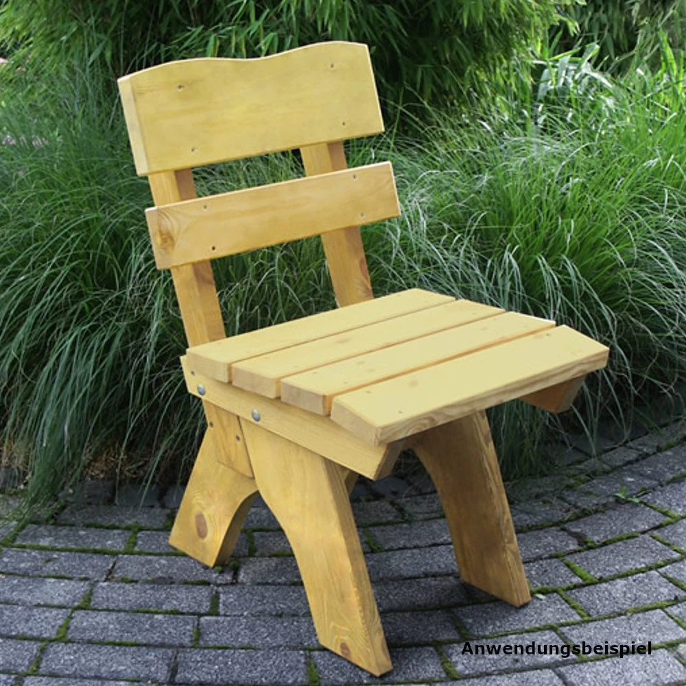 Dieser pflegeleichte Gartenstuhl wurde aus massivem Kiefernholz mit einer LattenstĂ€rke von ca. 30-34 mm gefertigt. Durch die hellbraune ImprĂ€gnierung des Holzstuhls wird die natĂŒrliche Optik bewahrt. Da das Holz vor der Verwendung kammergetrocknet wurde, ist es besonders robust und witterungsbestĂ€ndig. Dadurch ist der Stuhl gefestigt und stabil.