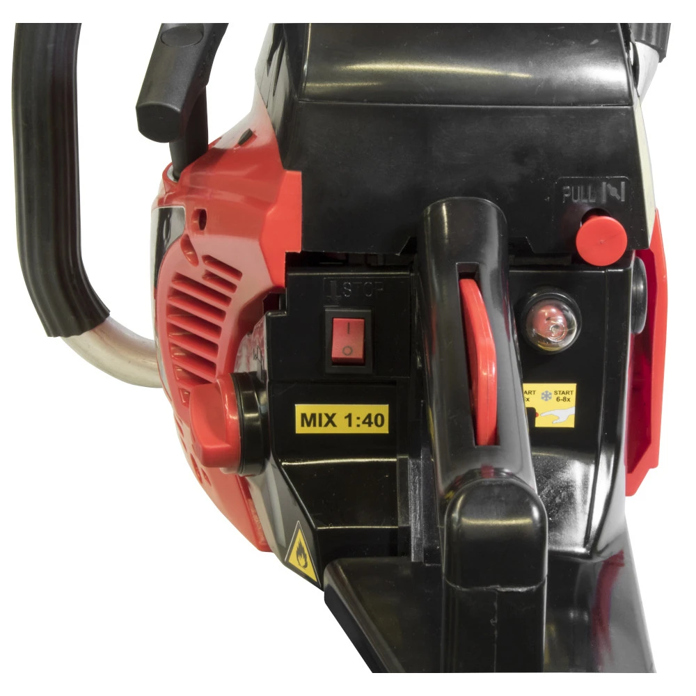 Die Benzin-KettensĂ€ge KW 400-53V von GERMANIA ist mit ihren 2,0 KW und 40 cm SchnittlĂ€nge ein leistungsstarkes Werkzeug fĂŒr alle SĂ€gearbeiten im Wald und im Haushalt. FĂŒr eine bessere Handhabung der MotorsĂ€ge verfĂŒgt sie ĂŒber einen Zusatzgriff und einer Kettenbremse. Somit ist die BenzinsĂ€ge ein idealer Helfer fĂŒr kleinere Schneidarbeiten an BĂ€umen oder Brennholzschnitte. Das dazugehörige Montagezubehör ist mit im Lieferumfang enthalten.