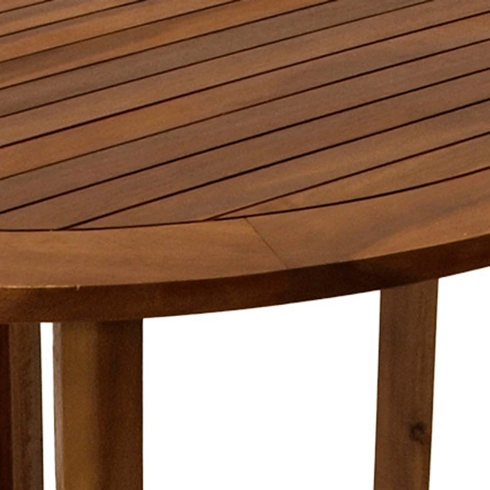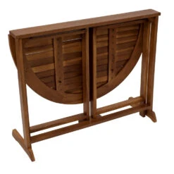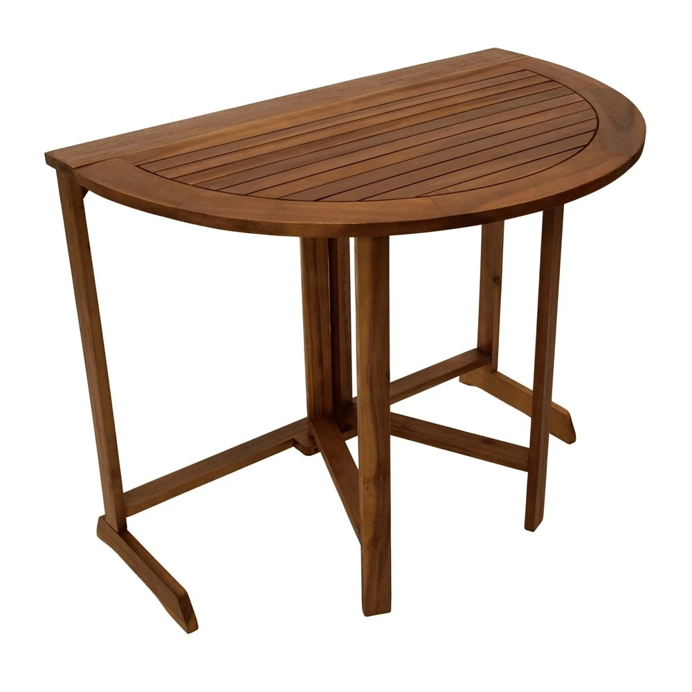 Dieser klappbare, halbrunde Gartentisch ist aus massivem und wetterfestem Akazienholz. Der bereits geölte Holztisch bringt durch das schlichte Design einen gemütlichen Look auf den Balkon. Bei Nichtgebrauch kann der handliche Tisch platzsparend zusammengeklappt werden.