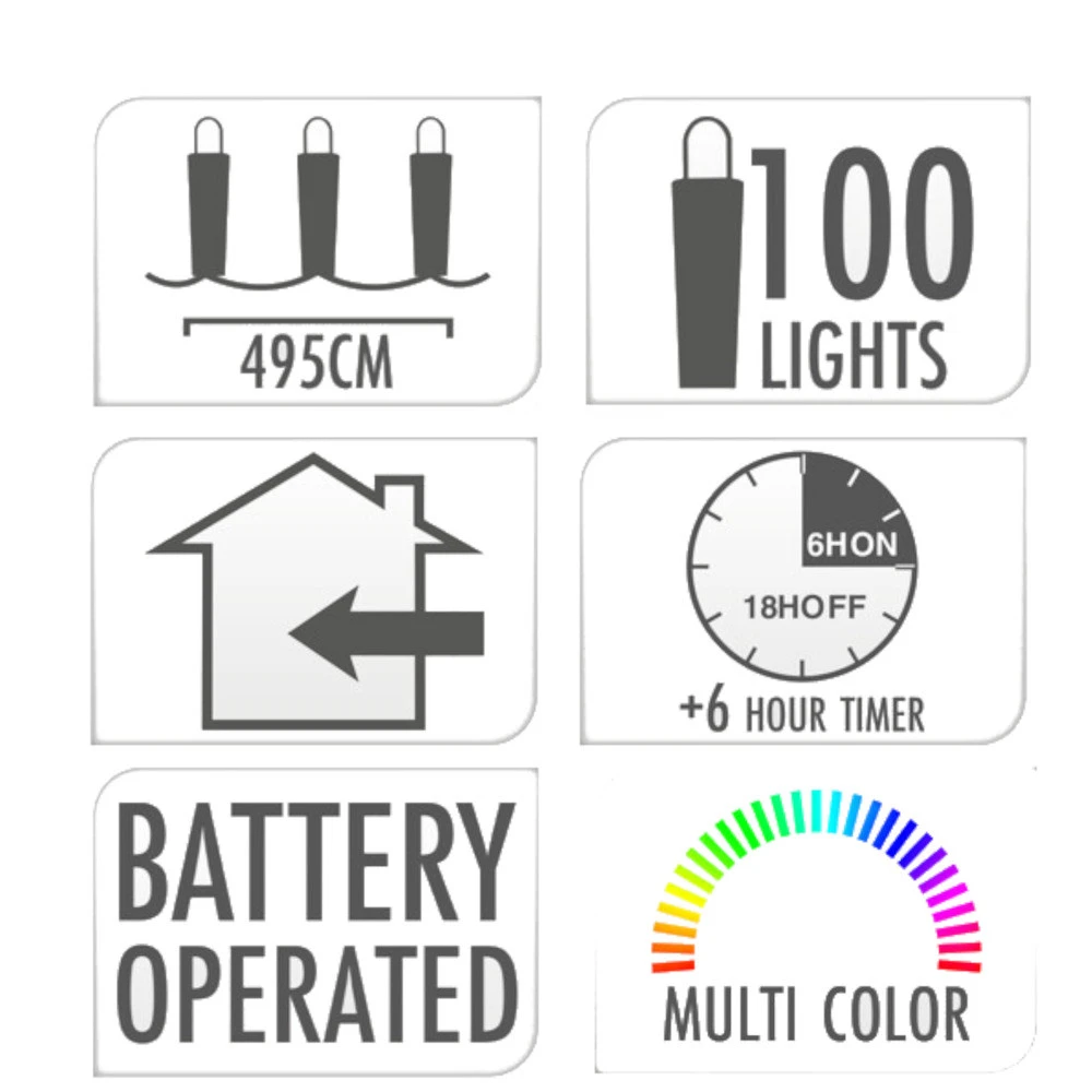 Die LED-Lichterkette mit 100 bunten LEDs eignet sich für eine stimmungsvolle Atmosphäre in deinen Wohnräumen und das nicht nur zur Weihnachtszeit. Darüber hinaus hat die LED-Beleuchtung eine integrierte Timerfunktion von sechs Stunden. Diese Lichterkette wird mit 3 x AA Batterien betrieben (nicht im Lieferumfang enthalten). Eine 10 cm lange Zuleitung ist im Lieferumfang enthalten.