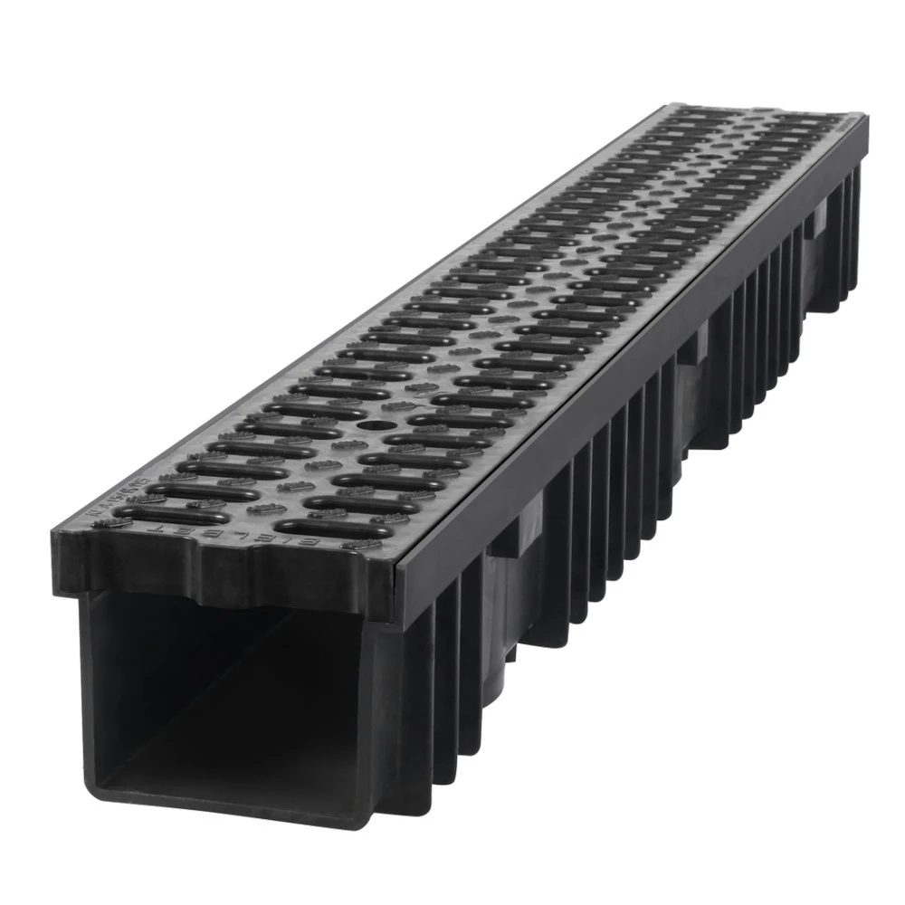 Linienentwässerung-Abflusskanal 1000×130 mm mit Abdeckrost aus PP-Kunststoff. Der Abdeckrost aus Kunststoff ist mit zwei Schrauben am Abflusskanal montiert. Der Abflusskanal hat drei Bodenabläufe und eine maximale Belastungsgrenze von 1,5 Tonnen.