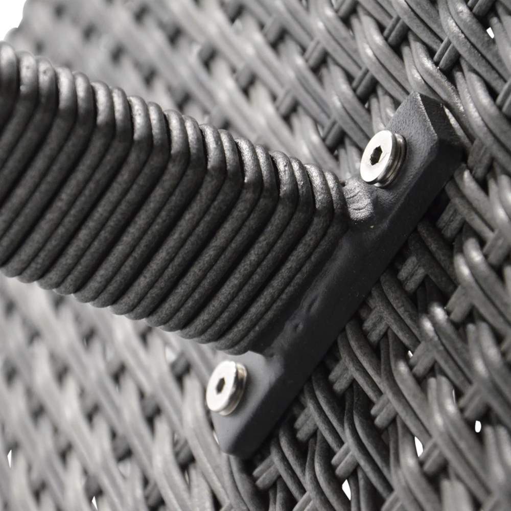 Das Gestell aller Teile besteht Aluminium mit einem geflochtenen, grauen Polyesterbezug in Rattanoptik. Somit ist die Gartengarnitur langlebig, witterungsbeständig und leicht zu transportieren. Passend dazu werden Auflagen und bequeme Rückenkissen mitgeliefert. Alle Auflagen und Kissen bestehen aus wasserabweisendem, dunkelgrauem Olefin 245 g/m².
