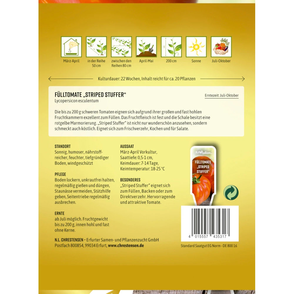 Die Fülltomate Striped Stuffer mit rotgelber, marmorierter Schale und bis zu 200 g schweren Früchten sieht nicht nur schön aus, sondern schmeckt zudem köstlich. Dank ihres festen Fruchtfleisches und der großen, fast hohlen Fruchtkammer eignet sich diese Tomatensorte ideal zum Füllen, Kochen oder für den Frischverzehr als auch für Salate. Ein Stecketikett ist mit inklusive.