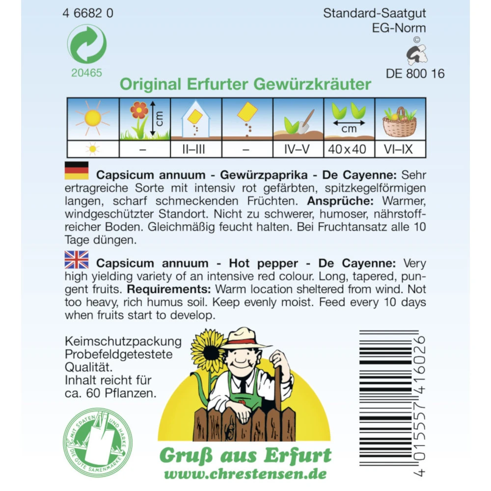 - 1 x Saatgut Gewürzpaprika De Cayenne scharf (ausreichend für ca. 60 Pflanzen)