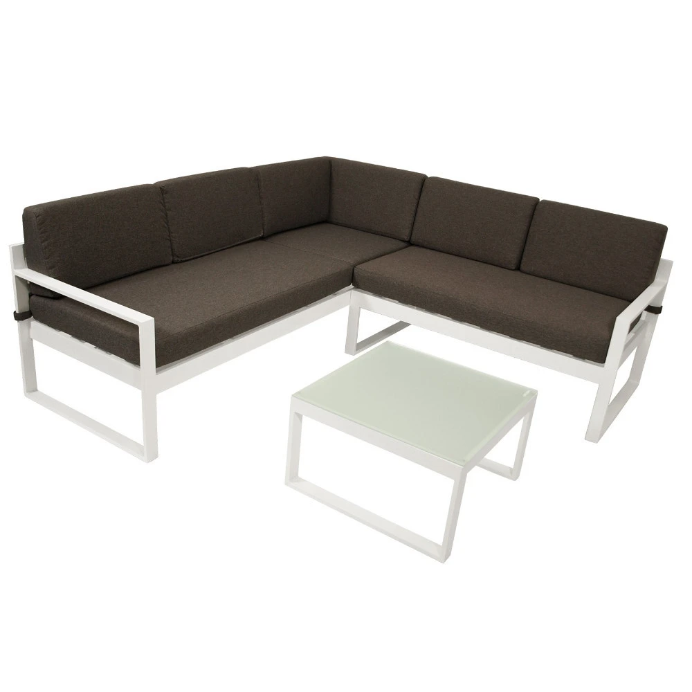 GenieĂe schöne Stunden im Freien und schaffe dir einen Platz der GemĂŒtlichkeit in deinem Garten, Balkon oder auf deiner Terrasse. Das komfortable Set bietet genug Platz fĂŒr 4 Personen. Die Eckgruppe ist sowohl fĂŒr den Innen- als auch fĂŒr den AuĂenbereich geeignet. Der Rahmen ist aus Aluminium mit weiĂer matt Pulverbeschichtung. Das Set besteht aus einen 4-Sitzer und einem Lounge-Tisch. Im Lieferumfang enthalten sind auĂerdem passende hellgraue Sitzauflagen und RĂŒckenkissen. Deko ist nicht im Lieferumfang enthalten!