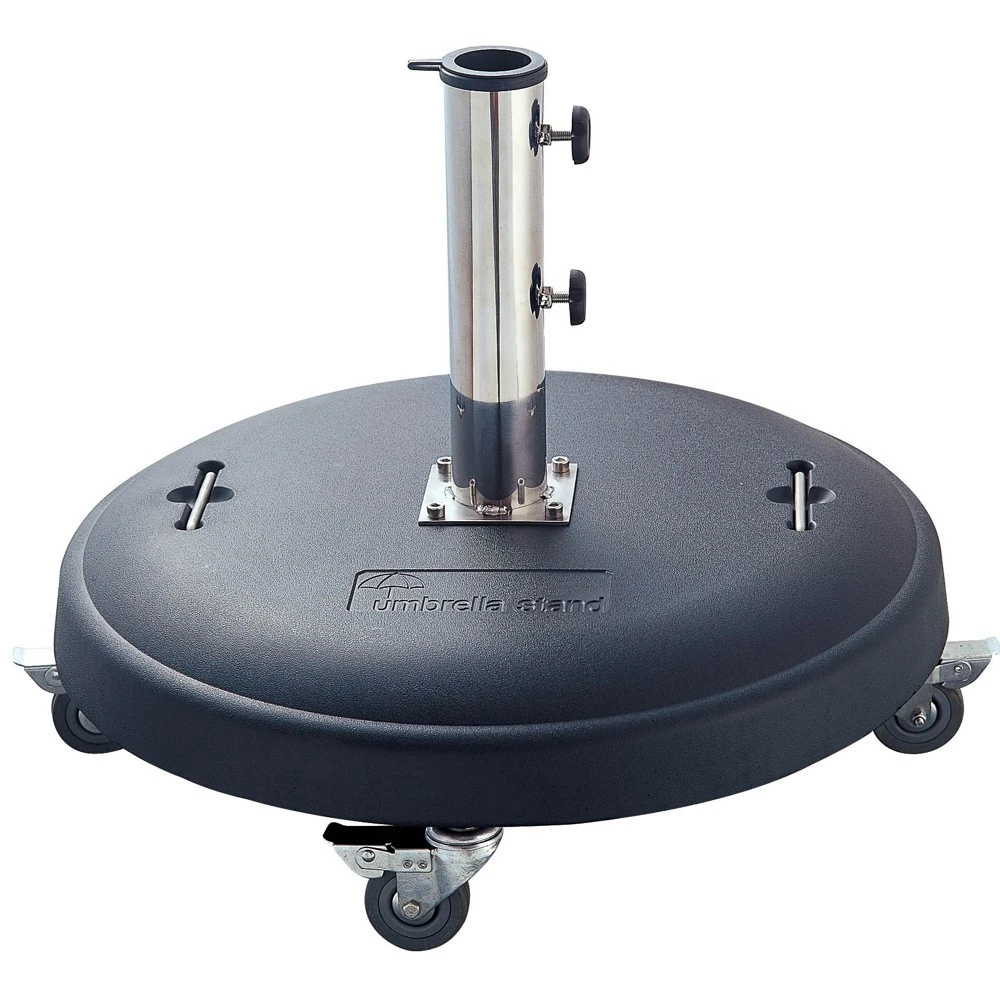Dieser StandfuĂ fĂŒr Sonnenschirme ist mit ca. 50 kg extrem standfest und hĂ€lt auch stĂ€rkeren Winden problemlos stand. Die Rollen sorgen dafĂŒr, dass der SchirmstĂ€nder trotz seines hohen Gewichts einfach und schnell transportier werden kann. Der Stein besteht aus aus gegossenem Polymerbeton, einem Acrylharz, das sehr robust und absolut witterungsbestĂ€ndig ist. Der StĂ€nder ist fĂŒr Sonnenschirme mit einem GestĂ€nge von bis zu 60mm geeignet, aber auch kleiner 57mm, 47mm oder 37mm GestĂ€nge können mit Hilfe der enthaltenen ReduzierstĂŒcke sicher und fest aufgestellt werden.