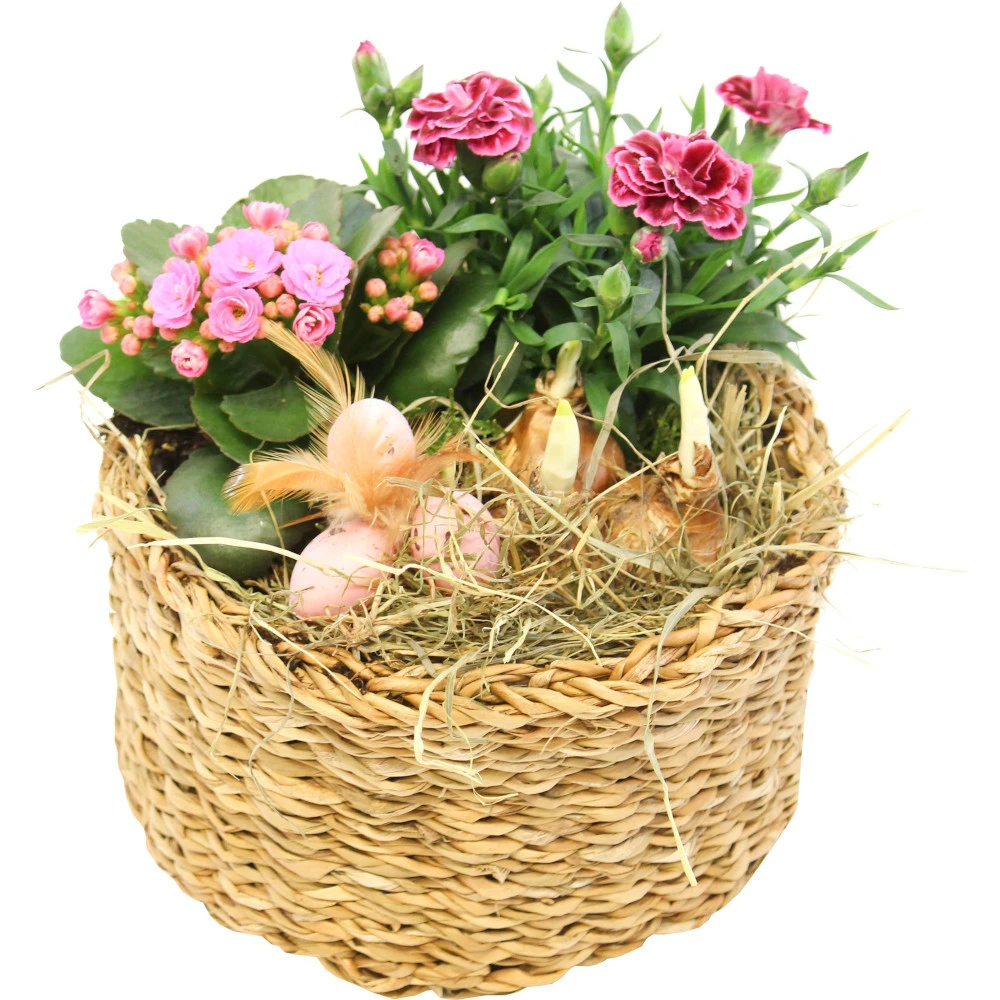 Dieser runde Weidenkorb eignet sich zur Dekoration in deinem Innenbereich, besonders zu Ostern. Das Gesteck ist mit 3 Pflanzen und Dekoration versehen.