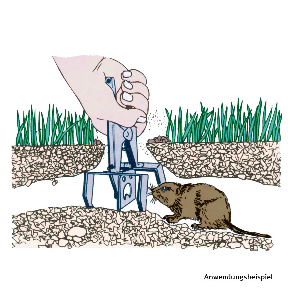 Die Zangenfalle wird von oben in den Wühlmausgang gesetzt, durch Zusammendrücken des Griffs gespannt und durch ein Stellplättchen auseinandergehalten. Für diese Wühlmausfalle wird kein Köder benötigt. Die Falle wird ausgelöst, wenn die Wühlmaus gegen das Metallplättchen läuft.